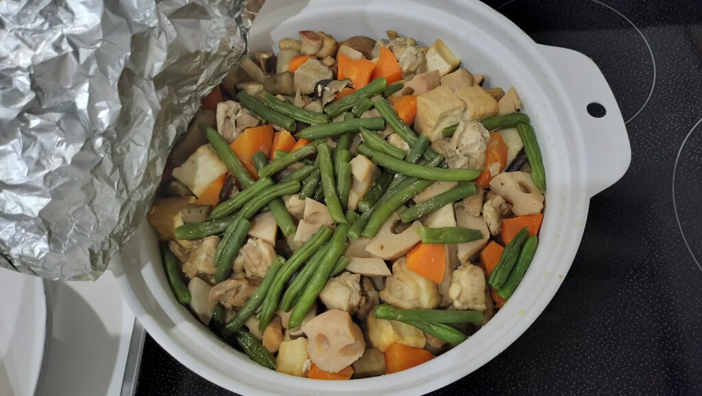 具材に火が通ったらいんげんを加え、落し蓋をして更に10分加熱