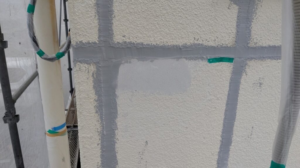外壁に問題がなければこの下塗り(微弾性フィラー塗装)で下塗り完了でも良いのですが、今回の場合は塗膜剥離が激しくシーリングで目地からはみ出して補修しましたので、それをカバーする為に鎖骨ローラーで補修跡を目立たなくさせます。