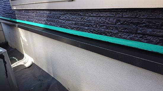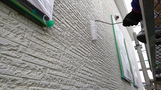 外壁塗装後に外壁を養生し、上塗り塗料を2度塗って仕上げます。