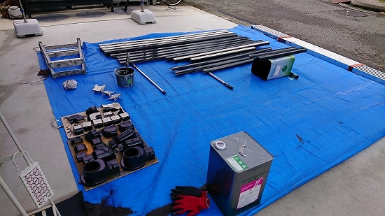 この時期は夜露が発生し素地が濡れてしまうので、即日中に下塗り(錆止め)まで行います。