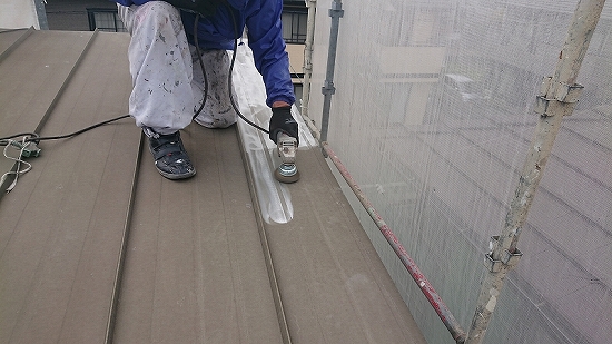 作業内容に移りますが、鋼板屋根という事で、下地調整が高圧洗浄では不十分だと考えました。
