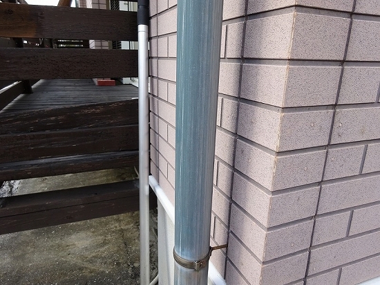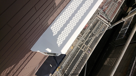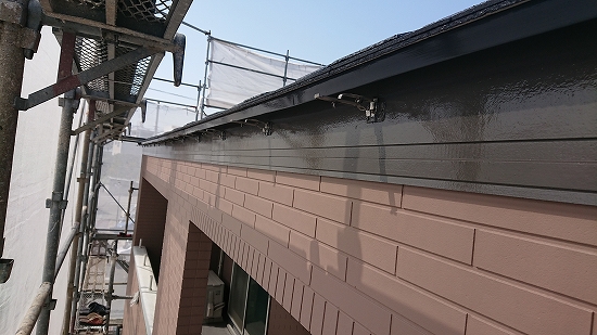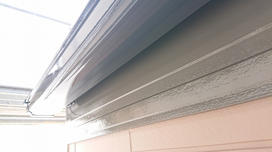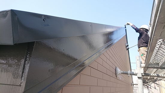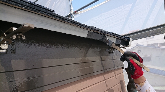 今回は雨樋と破風・鼻隠し板は色変えですので、軒樋を外した状態で目荒らし・清掃を行い、上塗り塗料で塗装していきます。