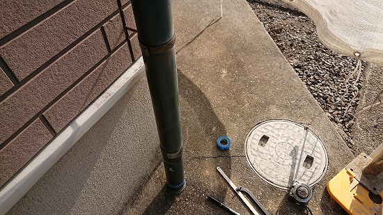 雨樋が障害となり、縦目地シーリングの撤去が困難ですので、足元で切り離してシーリングが出来るようにします。