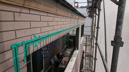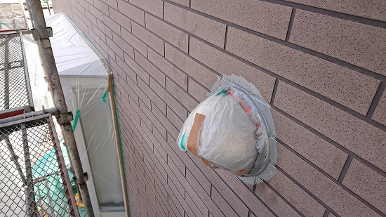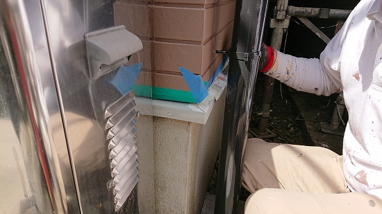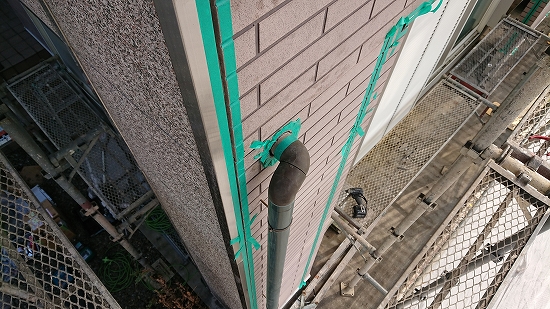 高圧洗浄が完了したら、塗らない部分の養生(マスキング)を行い、まず塗料が密着しない部分の対策を行います。