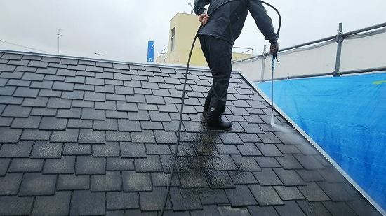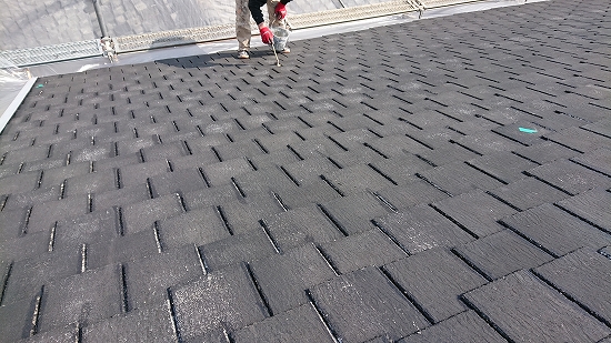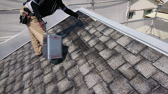 屋根は高圧洗浄から十分乾燥させた後、飛散対策を行い、下塗り(シーラー)を行います。