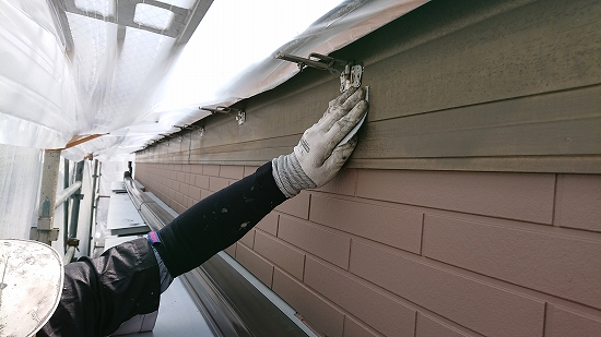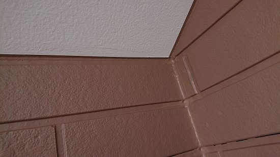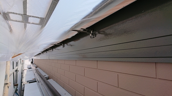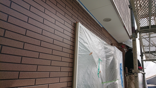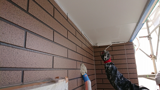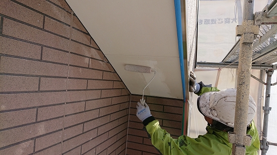 軒天井の塗膜乾燥後、軒天井を紙テープで養生し、外壁の上塗り1回目の塗布を行います。