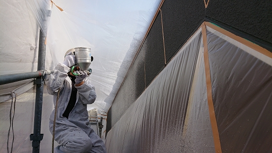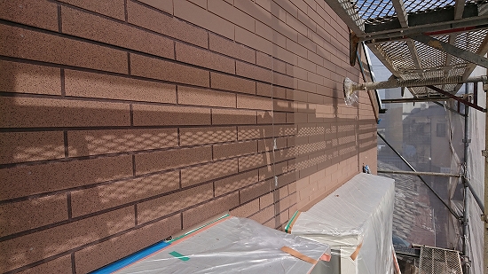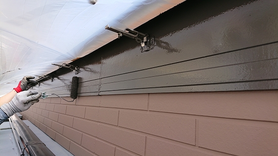 外壁塗装完了後、逆養生を行い、上塗り塗料を2度塗布して仕上げていきます。