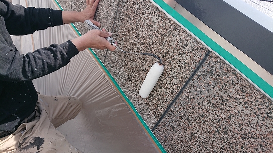 下塗り乾燥後、中塗り材をローラーと刷毛を用いて塗布します。
