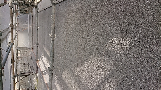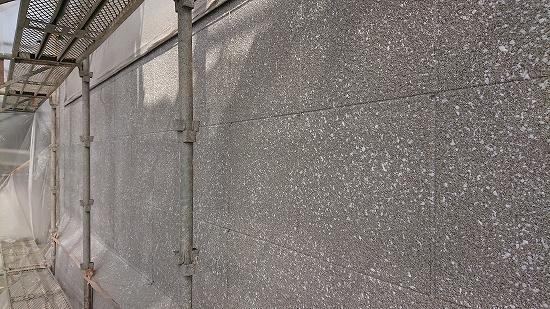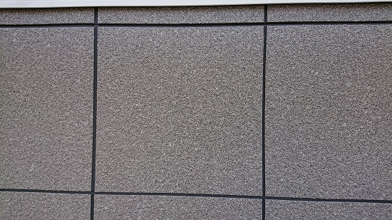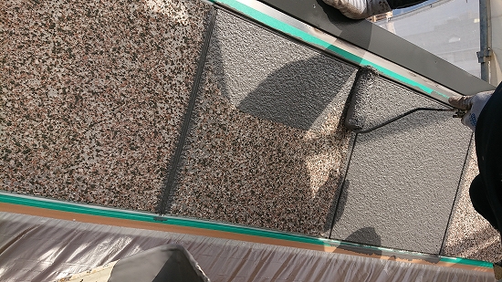 新築時は、目地部分が色分けの製品となっておりました(工場出荷製品として)ので、今回の塗装でも目地を色分けし、凸面を吹付多彩色仕上げを行います。