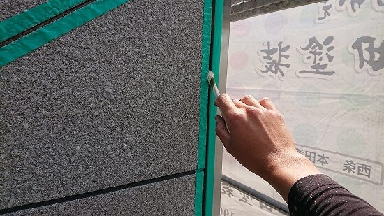 今回は両端目地などはシーリング後打ちで行いますので、シーリング養生後、専用のプライマーを塗布します。