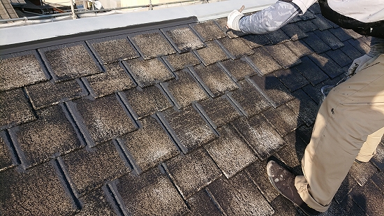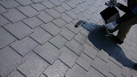屋根面は外壁面に比べて、紫外線の影響を受けやすいので、外壁面より先に劣化してしまうのですが、シリコン塗料上位のフッ素塗料を使用する事で塗膜劣化を穏やかにする事が出来ます。