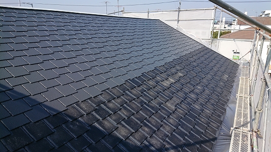 屋根の塗膜が完全に硬化した後、飛散養生を撤去して、破損部の上塗り2回目を塗布して仕上げます。