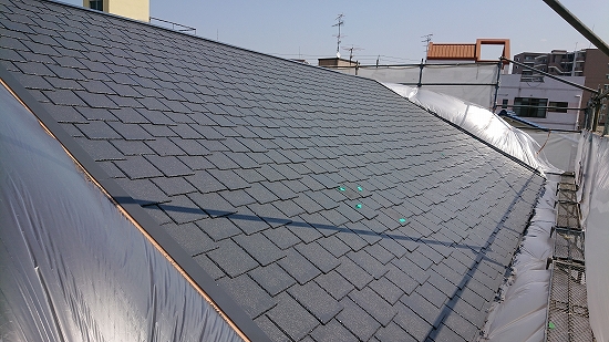 奥に見える茶色い紙のような物は、透湿防水シートです。
