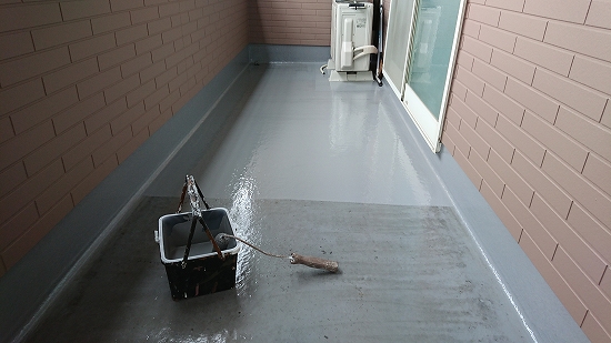 住宅におけるFRP防水は、新築時に繊維と樹脂を使用した防水層を現場で作成し、その上に紫外線に強いトップコートを塗布しています。